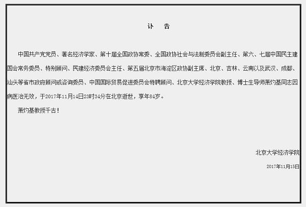 经济日报-中国经济网北京11月15日讯 今日北京大学经济学院网站发布讣告:著名经济学家、北京大学经济学院教授萧灼基于11月14日23时34分去世,享年84岁。