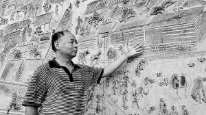 梁彦彬讲解《贾庄古镇市廛图》浮雕石壁。