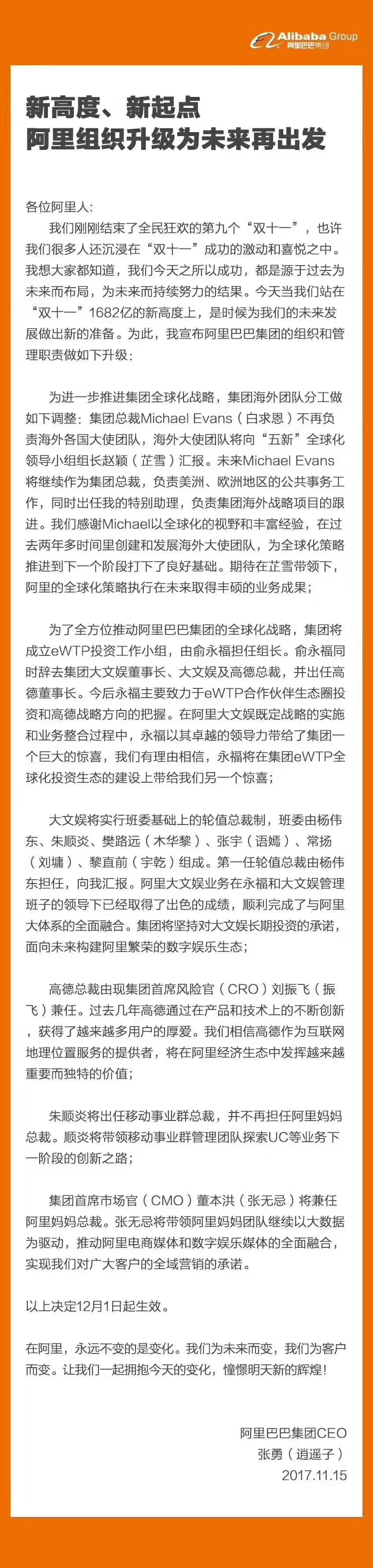 千龙网北京11月16日讯 阿里巴巴集团首席执行官张勇通过公开信宣布,俞永福将不再担任阿里巴巴集团大文娱董事长、大文娱及高德总裁职务,阿里巴巴大文娱将实行班委基础上的轮值总裁制,班委由杨伟东、朱顺炎、樊路远(木华黎)、张宇(语嫣)、常扬(刘墉)、黎直前(宇乾)组成。