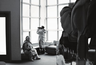 因纽特猎人雅各布·帕特鲁斯勒在用望远镜寻找海冰。每当部落里来了客人,他和老伴就会穿上民族服装到社区文化中心表演待客。
