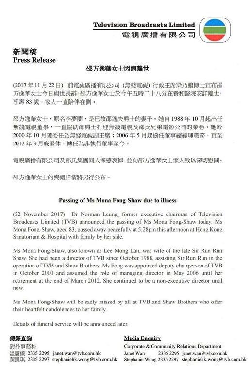 中国网娱乐11月23日讯11月22日,无线电视广播有限公司(TVB)董事方逸华因病安详离世,享年83岁。方逸华女士于今午5时28分在养和医院病逝,家人一直陪伴在侧,丧礼事宜将另行公布。