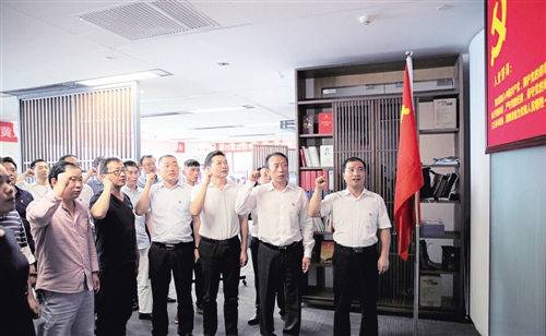 党的十九大后,黄久生(右二)带领农民工党支部集体重温入党誓词。晏乾坤摄