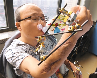 虽然全身大的伤情得到了治疗,但韦华的右手肘关节钙化,左手肌肉力量退化,双手难以打直,左手小指已经萎缩。图为韦华在练习自己喝水。新华社记者 陈燮 摄