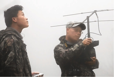 韦华(右)通过无线电确定大熊猫位置(资料照片)。新华社发