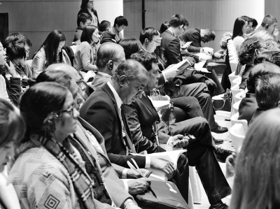 在日前举行的中国共产党与世界政党高层对话会上,与会嘉宾在会场阅读《习近平谈治国理政》。本报记者 余晓葵摄/光明图片