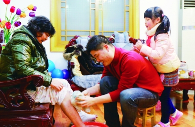 刘泳给母亲洗脚,女儿在给他捶背。本报通讯员 张英娇 本报记者 葛妍摄