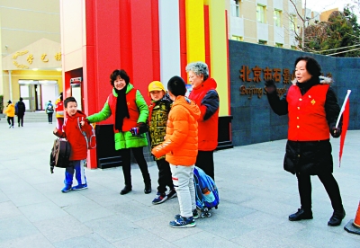 日前,石景山鲁谷社区义工“护花”服务队成员冒着严寒在银河小学门口护送孩子们安全进入校门。“护花”服务队是由五芳园社区11名退休党员自愿组成的义工队伍,她们每天在银河小学门口,定点定时守护小学生的交通安全已经整整十四年。学校处在一条狭窄的街道边,且门口正对着一条斜着的三岔口,小路上没有红绿灯,孩子上下学过马路,需要同时注意前、左、右三方的车辆,十分危险。她们将守护孩子们的安全视为神圣使命,不管炎炎夏日还是凛冽寒冬,都阻挡不了她们“护花”的脚步。本报记者 吴镝摄