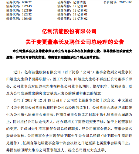 亿利洁能同时在公告中表示,公司于12月19日召开了公司第七届董事会第十次会议,审议通过了《关于选举公司董事长和聘任公司总经理的议案》,公司董事会选举尹成国为公司第七届董事会董事长,任期自董事会决议之日起至第七届董事会届满为止,同时担任公司法定代表人,将办理相关工商登记变更手续。鉴于上述董事长的变更,尹成国不再担任公司总经理职务。经公司董事会提名,董事会提名委员会审核,公司董事会决定聘任徐卫晖为公司总经理,任期自第七届董事会第十次会决议之日起至第七届董事会届满日止;并提名徐卫晖为公司董事候选人,提交公司股东大会选举。