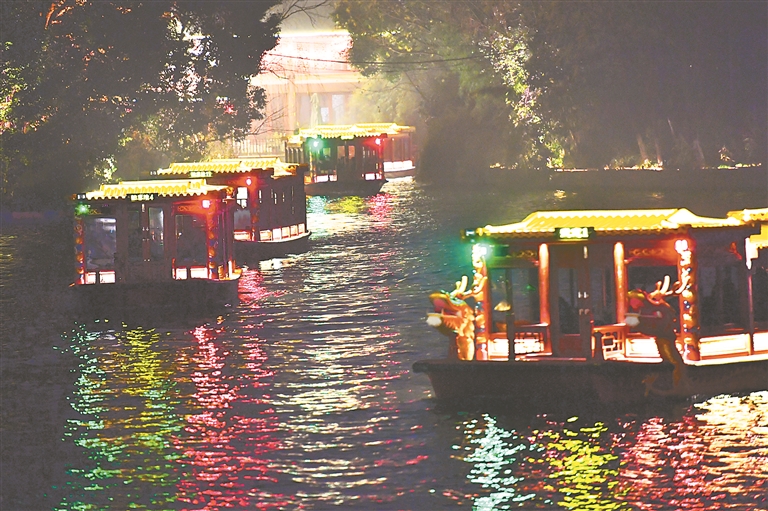 “起初,游览线路只是从平江桥到来燕桥,十几分钟就跑完了。后来线路不断延伸,一趟跑下来要50多分钟。”吕益峰告诉记者,2000年前,南京夫子庙景区由驾驶员操控的游船只有10艘,他开画舫,妻子驾摇橹船。随着游客的增多,游船数量也不断增加,如今仅内秦淮河线路就有各式游船60多艘。今年元旦,夫子庙泮池码头的48艘画舫平均每艘要往返10趟,靠岸即走,几乎没有半刻停歇。
