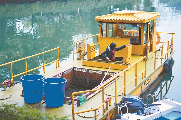 保洁船航行速度慢,游船“超车”时,夫妻俩偶尔会打个招呼。