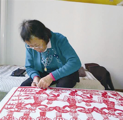 作为青岛首批非物质文化遗产继承人,王明香从8岁开始接触剪纸,到现在已经有60多年的经验了。如今剪纸已经深深地融入了老人的生活中,目前她家里珍藏的剪纸作品上千幅,在各种剪纸比赛中获奖50余次,作品被世界20多个国家收藏。在她的眼中,花鸟、虫鱼、园林、仕女皆能“入剪”,样样逼真传神,剪刀下能翻飞出一个神奇的世界。