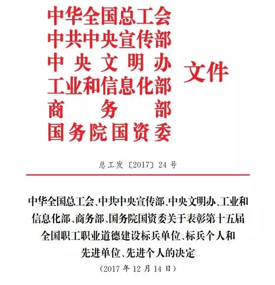 为深入学习贯彻党的十九大精神,大力弘扬劳模精神、工匠精神,营造劳动光荣的社会风尚和精益求精的敬业风气,激励全国广大职工坚定理想信念,在新时代的伟大实践中锐意进取、埋头苦干,不断作出新贡献,由全国总工会、中央宣传部、中央文明办、工业和信息化部、商务部、国务院国资委组成的全国职工职业道德建设指导协调小组决定,授予中建二局安装工程有限公司等20个单位“全国职工职业道德建设标兵单位”称号,授予马荣等20名同志“全国职工职业道德建设标兵个人”称号,授予北京市东城区东花市街道工会服务站等42个单位“全国职工职业道德建设先进单位”称号,授予于秀娟等44名同志“全国职工职业道德建设先进个人”称号,并予以表彰。