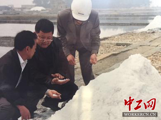图为叶秀元(中)生前与制盐工人探讨传统晒盐工艺