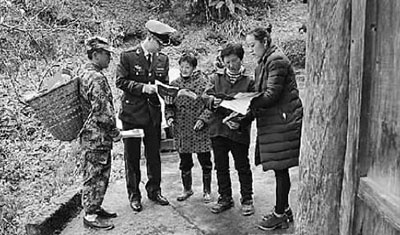 年关将近,火灾隐患增加。志愿消防员们背着背篓进村入户,将消防知识送进家门。曾岱秫摄/光明图片