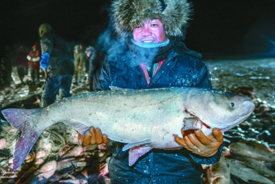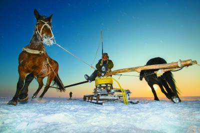 经过3个多小时的作业,他们在厚度超过50厘米的坚硬冰面上,凿开几百个间隔10米的冰洞。然后把长度达2公里的渔网塞进凿开的冰洞,就像穿针引线那样将一个一个冰洞连接起来,从而在水中形成巨大的椭圆形网圈。收网时,再用4~6匹马像拉磨似地转圈拉动连接起来的网,经过数十人的通力合作才将多得难以估量的鱼随着渔网一起拉出水面。