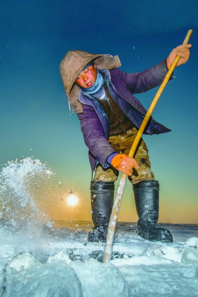 凿出冰洞后,渔民接着就要用“冰蹦子”掏冰。孙晓峰摄