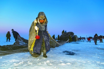 渔民把捕获的鱼装上车运回渔场仓库,一直要忙到日落时分,鱼多的时候,甚至要忙到第二天天明。据渔场统计,查干湖冬捕单网出鱼的最高纪录是26万公斤。