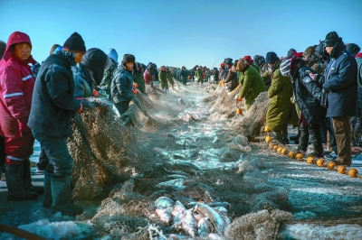 劳动与收获的场面感染着现场的人们,并吸引着更多的旅游者慕名来到查干湖。随着2017年长白乌铁路动车组的运行和松原查干湖机场的启用,到查干湖参与、体验冬捕的游人也越来越多。