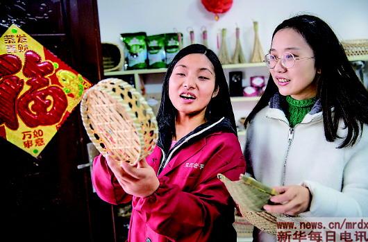 ▲1月16日,刘青青(左)在79岁的杨其贵家指导他编制竹制品。杨其贵在刘青青的网店上出售竹制品,年收入达6000余元。