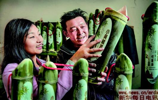 ▲1月16日,刘青青(左)在村民吴孝兵家了解竹筒酒生产情况。这种竹筒酒在她的网店代售,很受消费者青睐。