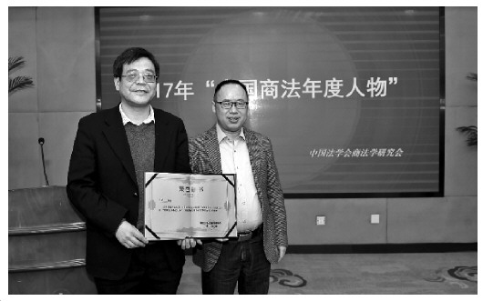 图为2016中国商法年度人物,北京大学教授蒋大兴(右)为冯果教授颁发证书。本报记者 杨晋峰 摄
