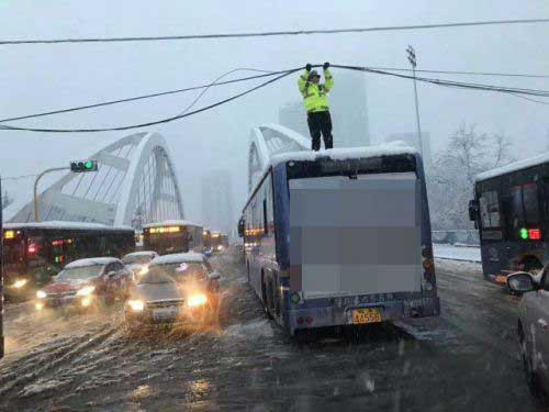 1 月 4 日上午,一场突如其来的大雪下得许多市民措手不及。4日清晨,在安徽省合肥市蒙城路桥附近,漫天飞舞的大雪中,合肥交警支队庐阳大队六中队协警熊陈站在公交车顶高举电缆的情景吸引了路人的目光。而他徒手举着电缆的照片刷爆了朋友圈。