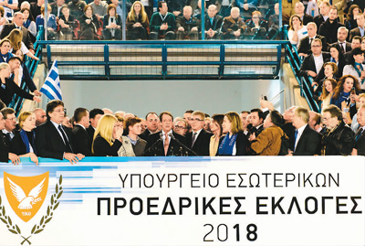 图为2月4日,在塞浦路斯首都尼科西亚,成功连任塞浦路斯总统的尼科斯·阿纳斯塔夏季斯(中)发表讲话。