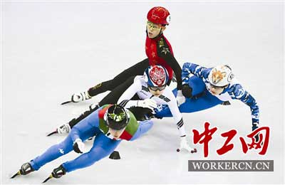 2月13日,在短道速滑女子500米半决赛中,范可新与对手发生身体接触,被判犯规,无缘决赛。当晚,有4名中国短道速滑选手在比赛中被判犯规。图为范可新(红色头盔)的比赛瞬间。