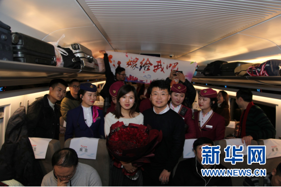在北京工作的蒋先生告诉记者,为了给女朋友张女士一个惊喜,他和几个朋友策划了这个“复兴号”上的求婚仪式,“准备了两个多月,一切都是悄悄进行。”象征浪漫的99朵玫瑰,寓意爱情的钻戒,还有印了“嫁给我吧”的横幅,“今天你要嫁给我”的音乐,让张女士感动不已,“我愿意嫁给他,谢谢他给了我这么浪漫的爱情,心里很暖。”