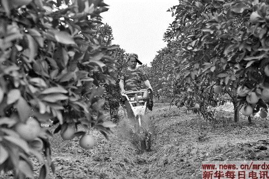 在广东廉江的红橙果园里,果农用农机具将土壤犁出沟壑,然后施以有机肥料(1月20日摄)。 新华社记者梁旭摄