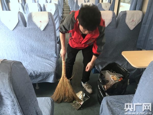 尽管如此,但作为列车服务人员,王铭还得耐心劝导,做好旅客的安抚工作。王铭告诉记者,一趟行程下来,要在火车上呆30多个小时,其中至少有20多个小时没法休息。当火车到达终点站后,他的工作仍然没有结束,所有乘客下车后,既要清理打扫列车,还要继续检查车厢,为退乘做准备。而所有的这些工作必须在二十分钟之内完成。王铭开玩笑说,每次工作下班,都有种“身体被掏空”的感觉。