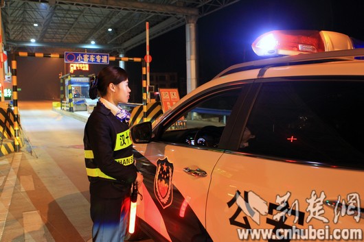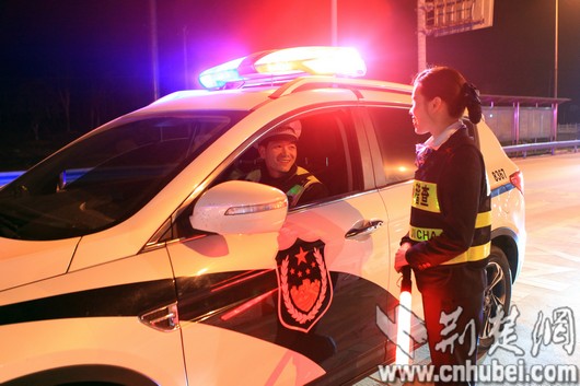 图为:晚21点,遇高警巡查路况,互祝“新年快乐”,并咨询路况。除夕夜,坚守一线的不仅有收费人员,也有路政、高警在路上为过往车辆保驾护航。杨昆摄