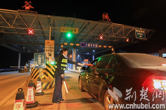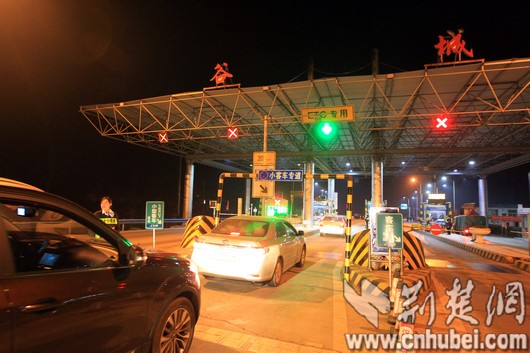 图为:免费车辆缓缓驶离收费站。杨昆摄
