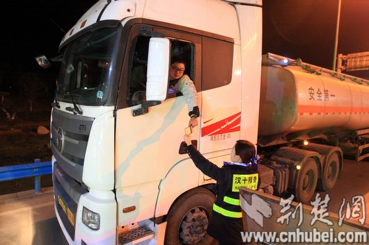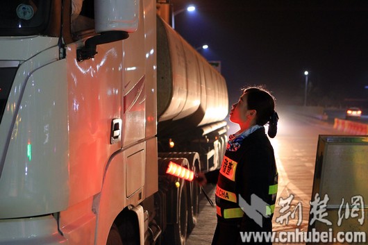 图为:免费期间"两客一危"车辆限行,饶丹严把入口关,查看车辆证件,核对信息是否属于油气保障运输车辆,是否可以通行。杨昆摄