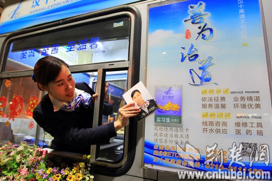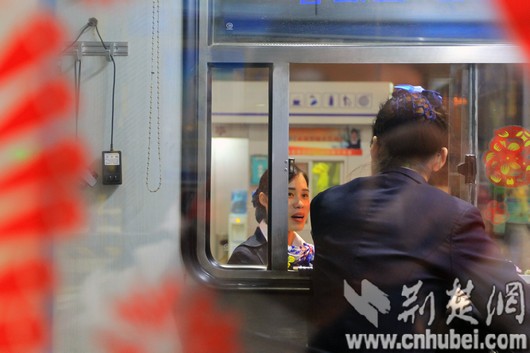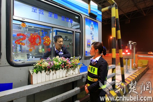 图为:收费员周洁是今年才进单位的新员工,第一次春节值班,饶丹询问她第一年春节在岗情况。杨昆摄