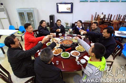 图为:年夜饭开始了,所里值班人员一起欢庆新年的到来。杨昆摄