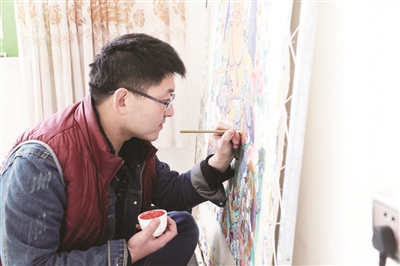 1984 年出生在山东烟台龙口、现年34 岁的汉族小伙范庆基已经在热贡地区生活了差不多7 个年头。7年来,他在这家叫做“龙树”的画苑里学习和工作,不仅学会了热贡唐卡的绘制技艺,而且还收获了和当地少数民族姑娘的一份爱情,即将步入婚姻的殿堂。