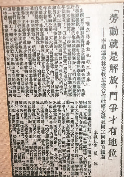 这篇报道在最后这样写道:“美满、 幸福的家庭,就这样普遍地在西沟村出现了。申纪兰在总结她们一年来在劳动战线上所作的斗争时说:‘劳动就是解放,斗争才有地位。 ’”