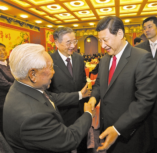 右图 2013年1月1日,全国政协在北京举行新年茶话会。这是习近平同志与杨汝岱同志握手。