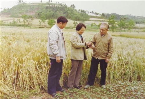 1989年10月,杨汝岱同志(右一)在四川农村考察粮食生产。