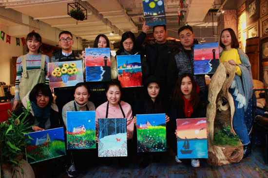 灯光柔和的咖啡馆里,伴着轻快的音乐,十来个人在相机前站定,开心地举着自己刚刚画好的画,随着清脆的快门声,相机将这一幕定格。他们手中的画作色彩鲜艳,有的还极具个性。他们都是同一个唐醋画吧的学员,这些人中,大部分学画时间还不足一周,有的人甚至是第一次接触油画,是真正的零基础画手。