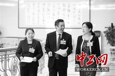 3月6日,来自工会界的钟正菊委员(左)、许启金委员(中)、张恒珍委员就各自的提案进行交流。三位委员均来自一线,在企业如何留住年轻人以及提高一线技术工人的荣誉感和获得感上产生共鸣。工人日报—中工网记者 王伟伟 摄