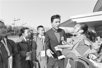 图为全国政协委员、百度公司董事长兼首席执行官李彦宏接受两会小记者采访。