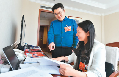 史玉东代表(左)与王欣会代表就宪法修正案草案进行讨论。