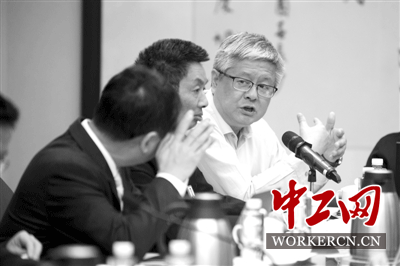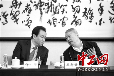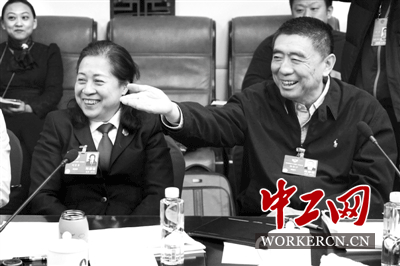 政协工会界别就两高报告进行分组讨论,中国保利集团公司党委书记、董事长徐念沙委员(右)与委员交流意见。