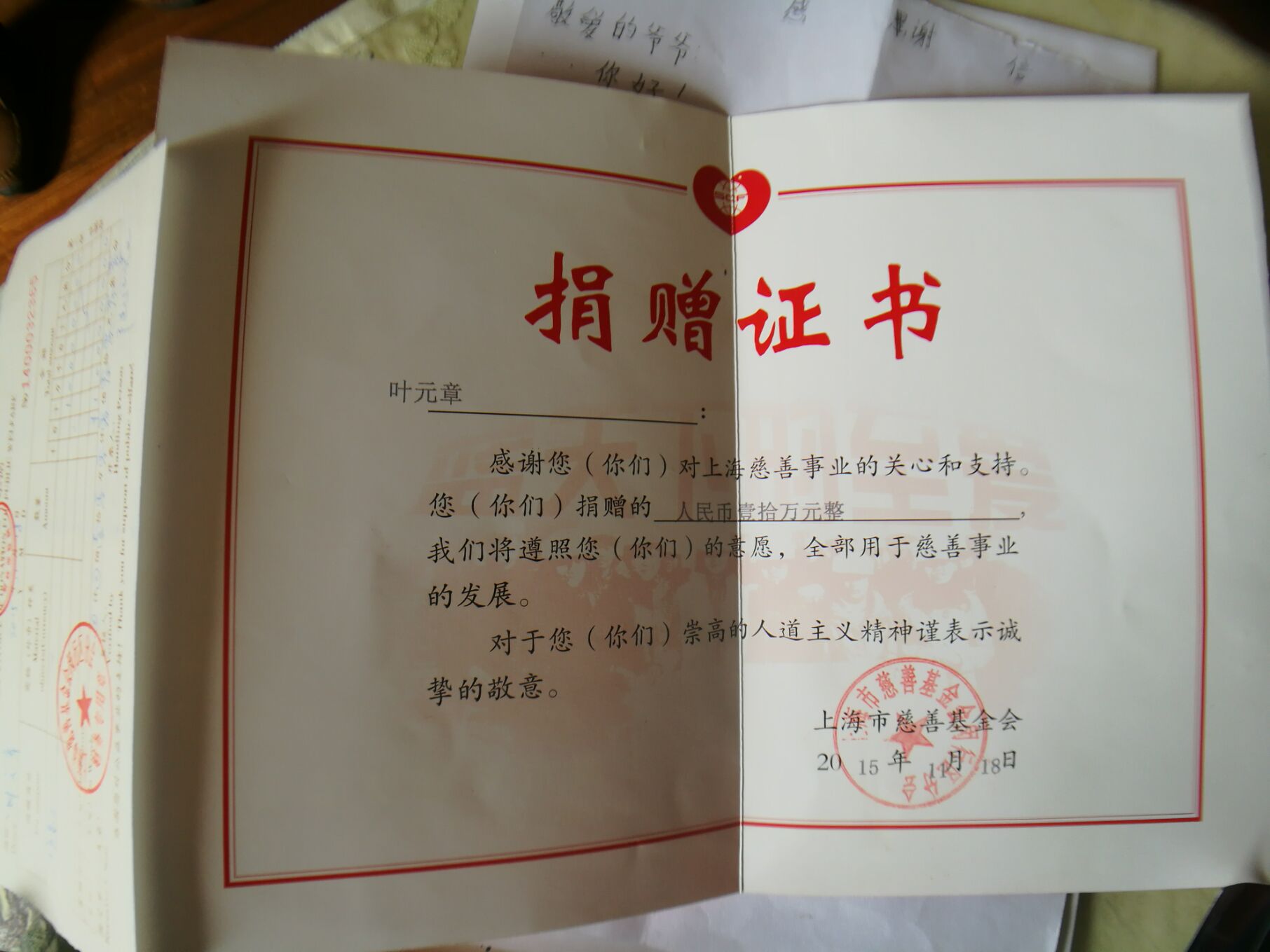 上海市慈善基金会发给叶老的捐赠证书。王晨辉 摄