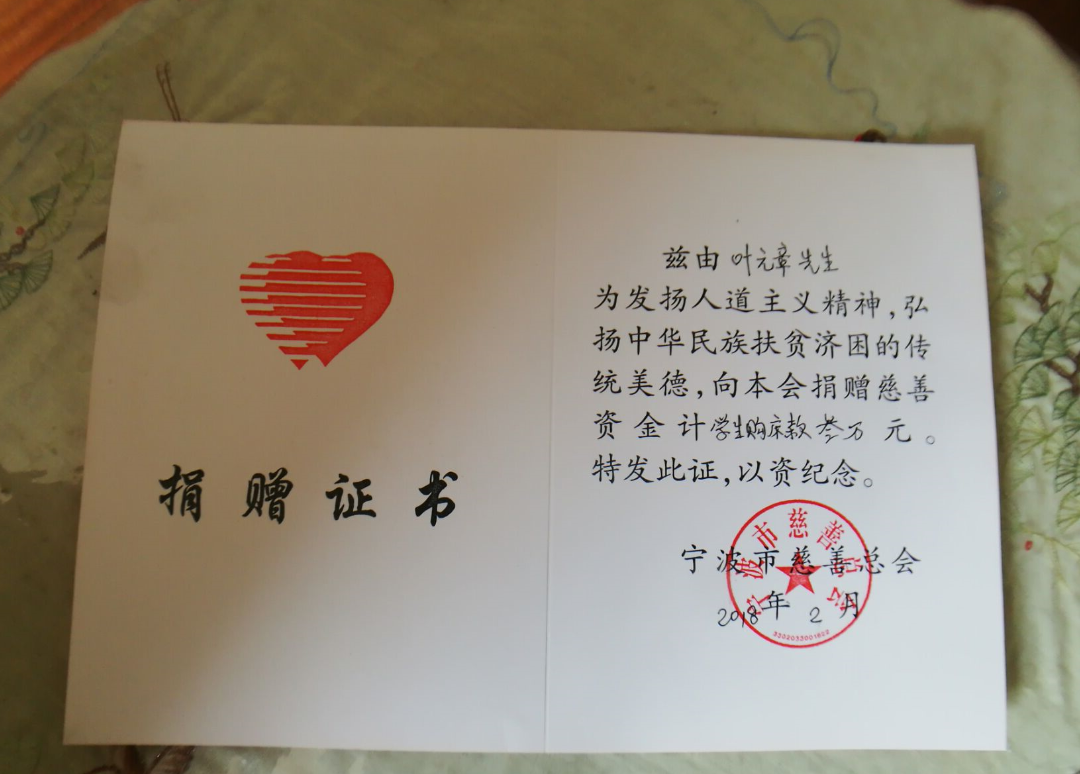 宁波市慈善总会寄给叶老的捐赠证书。王晨辉 摄