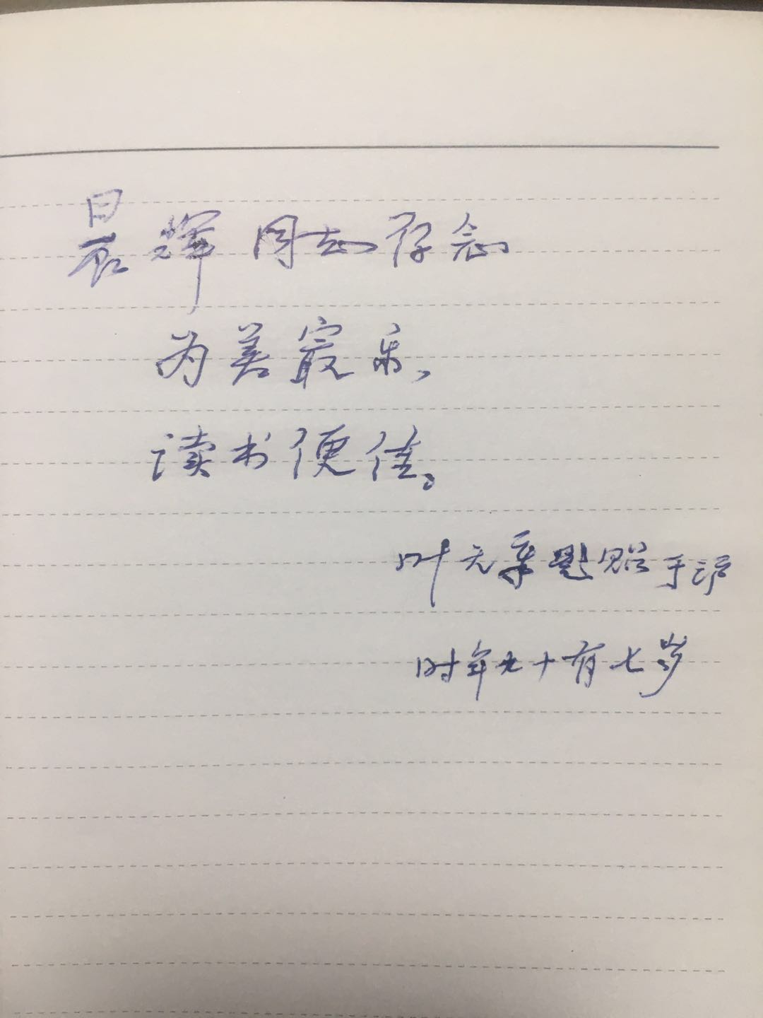 结束采访前,叶老在记者采访本上留下了“为善最乐,读书便佳”8个字:“这8个字,是我们家的家训,我把它送给你,也希望通过你们,让这种行善助人的爱心行为,被更多人接受!”