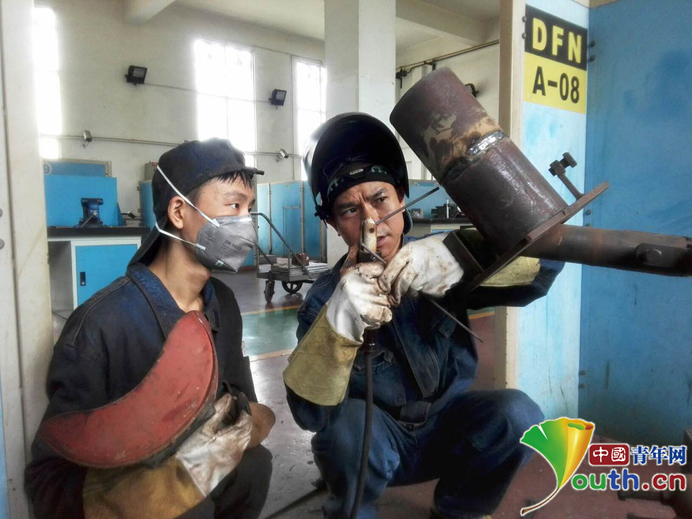 谢强(右)在向青年焊工传授技艺。东方锅炉供图