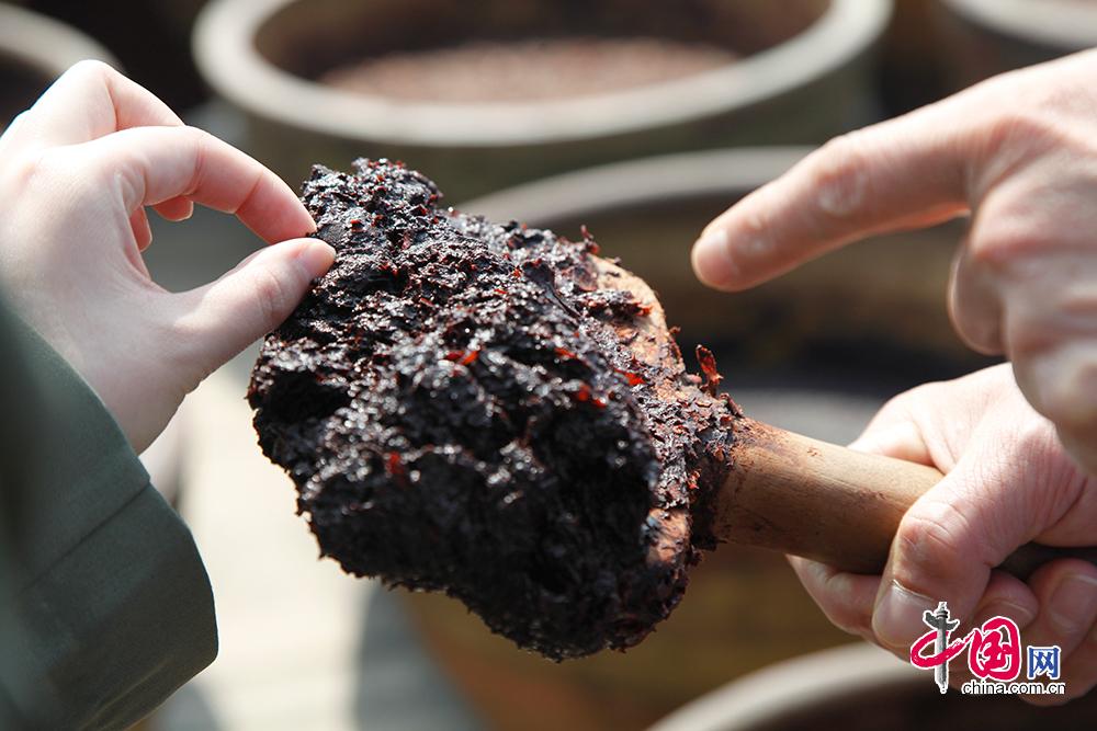 据了解,一缸郫县豆瓣每天翻晒12次,三年特级郫县豆瓣至少经历翻晒13140下,五年特级郫县豆瓣至少经历翻晒21900下。中国网 李佳摄影